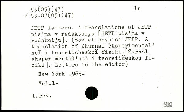 JETP letters. A translations of JETP pis 'ma v redaktsiyu ['JETP' pis'ma v redakciju]. (Soviet physics JETP. A translation of Zhurnal eksperimental’ noi i teoreticheskoi fiziki.[Zurnal eksperimental'noj i teoreticeskoj fi-ziki]. Letters to the editor)