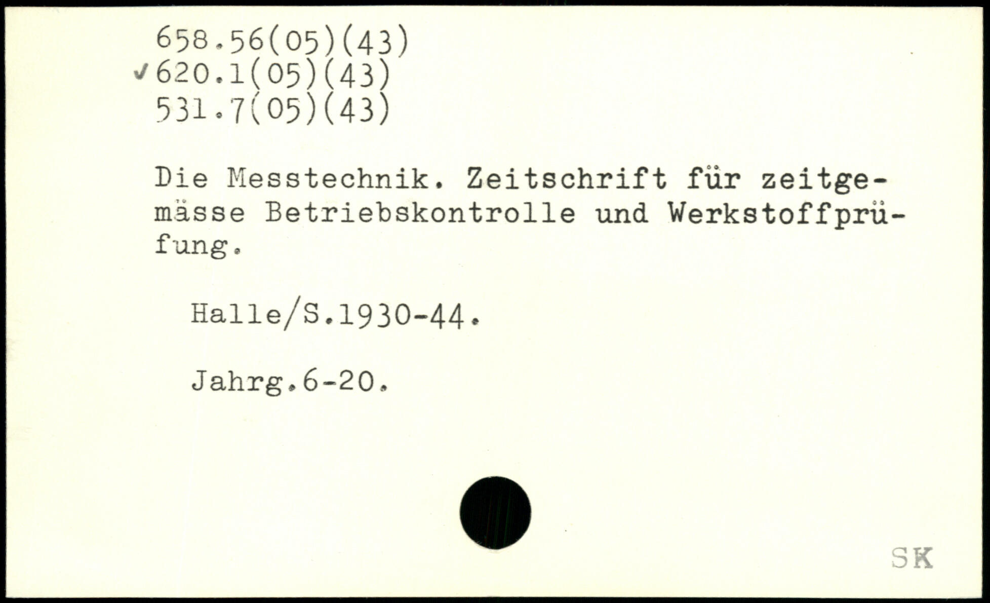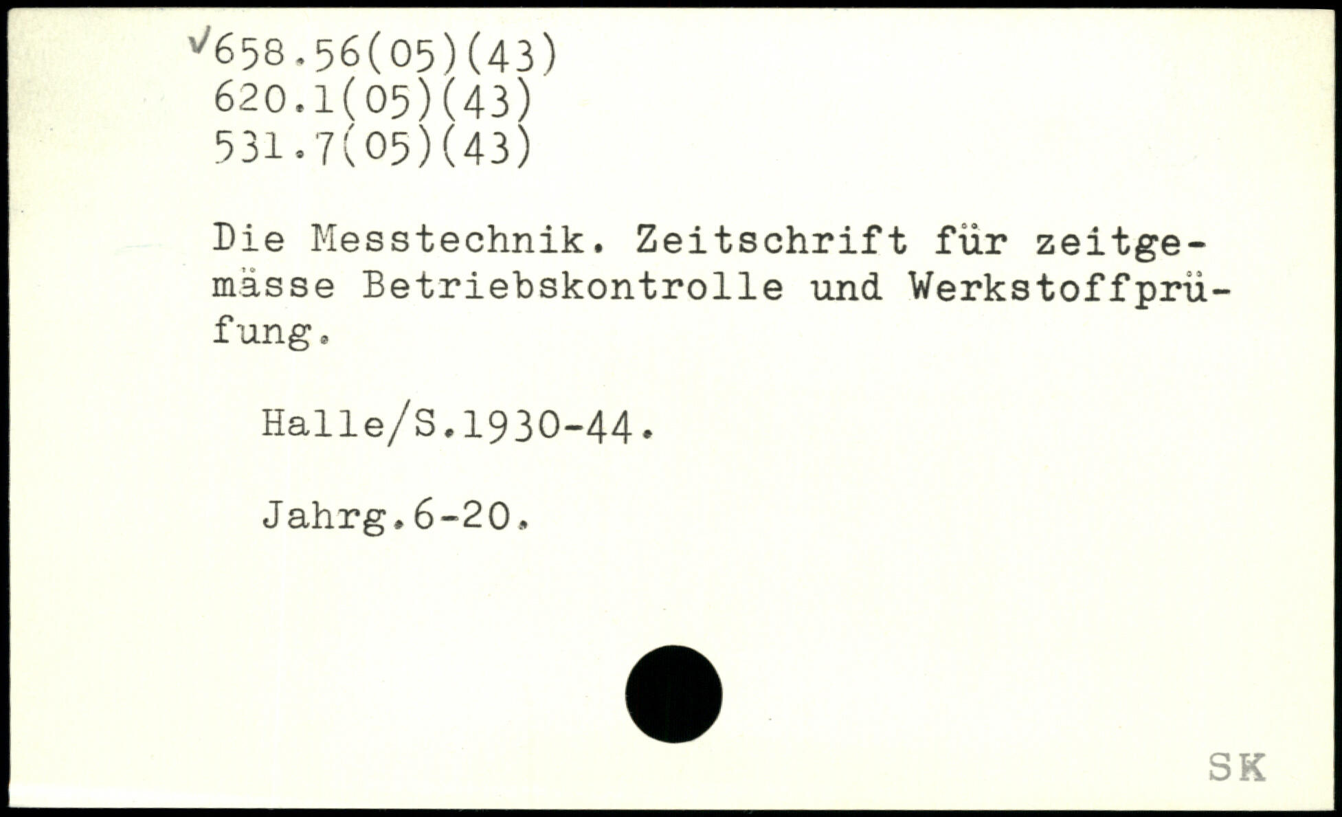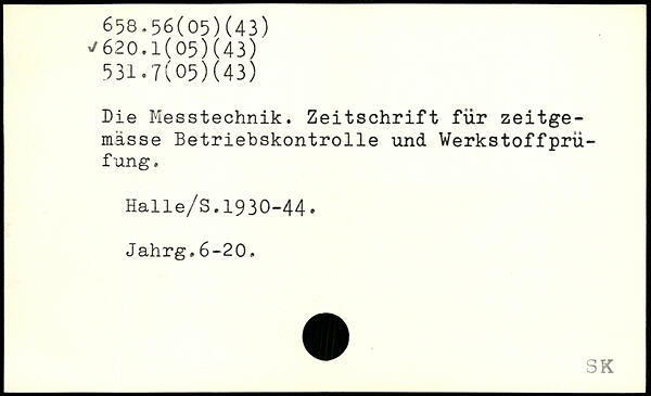 Die Messtechnik. Zeitschrift für zeitge-mässe Betriebskontrolle und Werkstoffprüfung. Halle/S.1930-44. Jahrg,6-20.