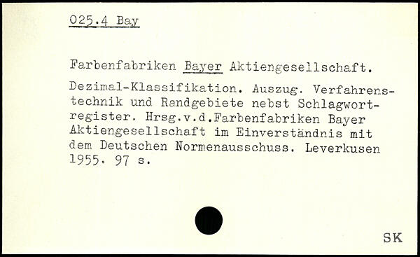 Farbenfabriken Bayer Aktiengesellschaft. Dezimal-Klassifikation. Auszug. Verfahrenstechnik und Randgebiete nebst Schlagwortregister. Hrsg.v.d.Farbenfabriken Bayer Aktiengesellschaft im Einverständnis mit dem Deutschen Normenausschuss. Leverkusen !955.