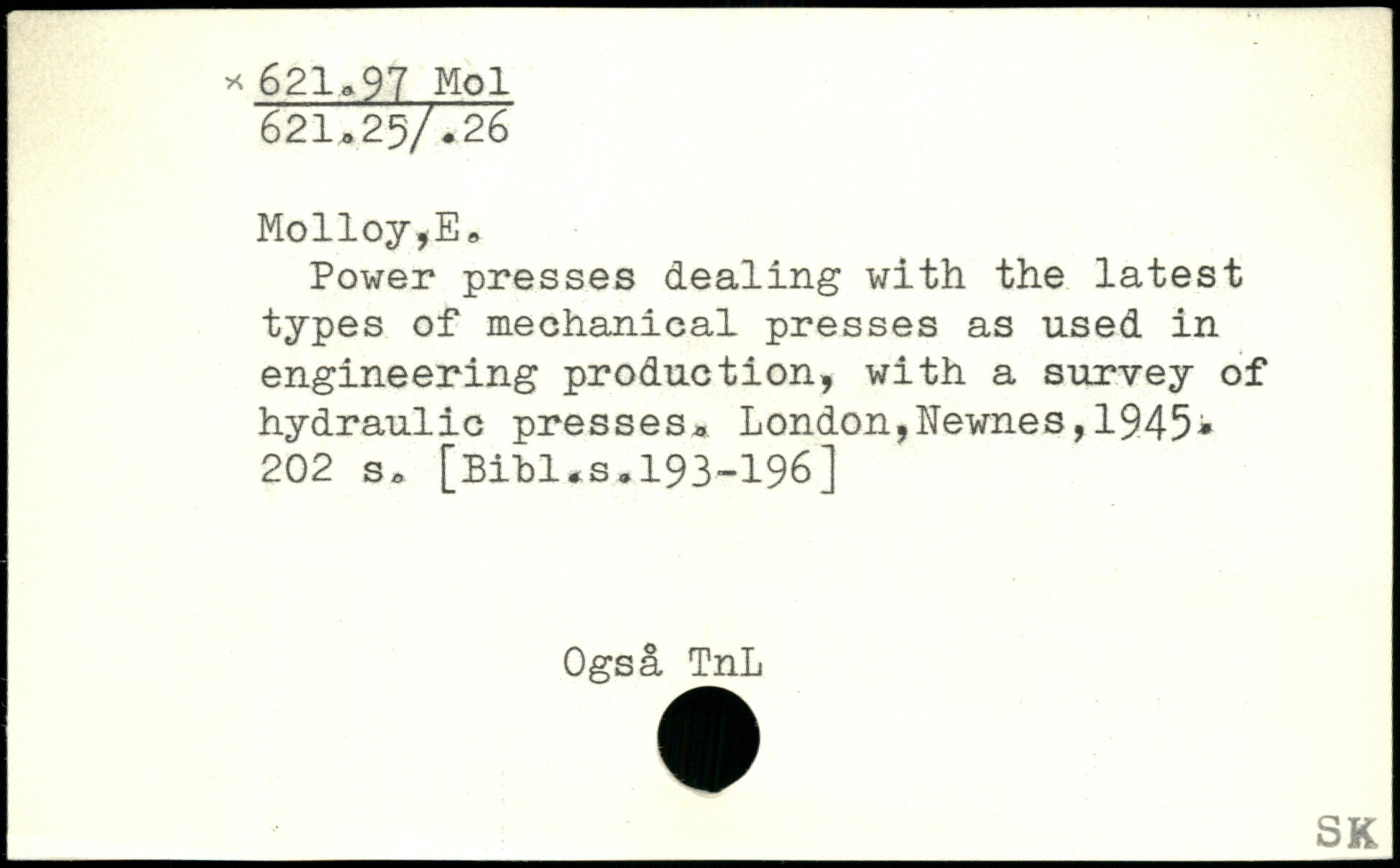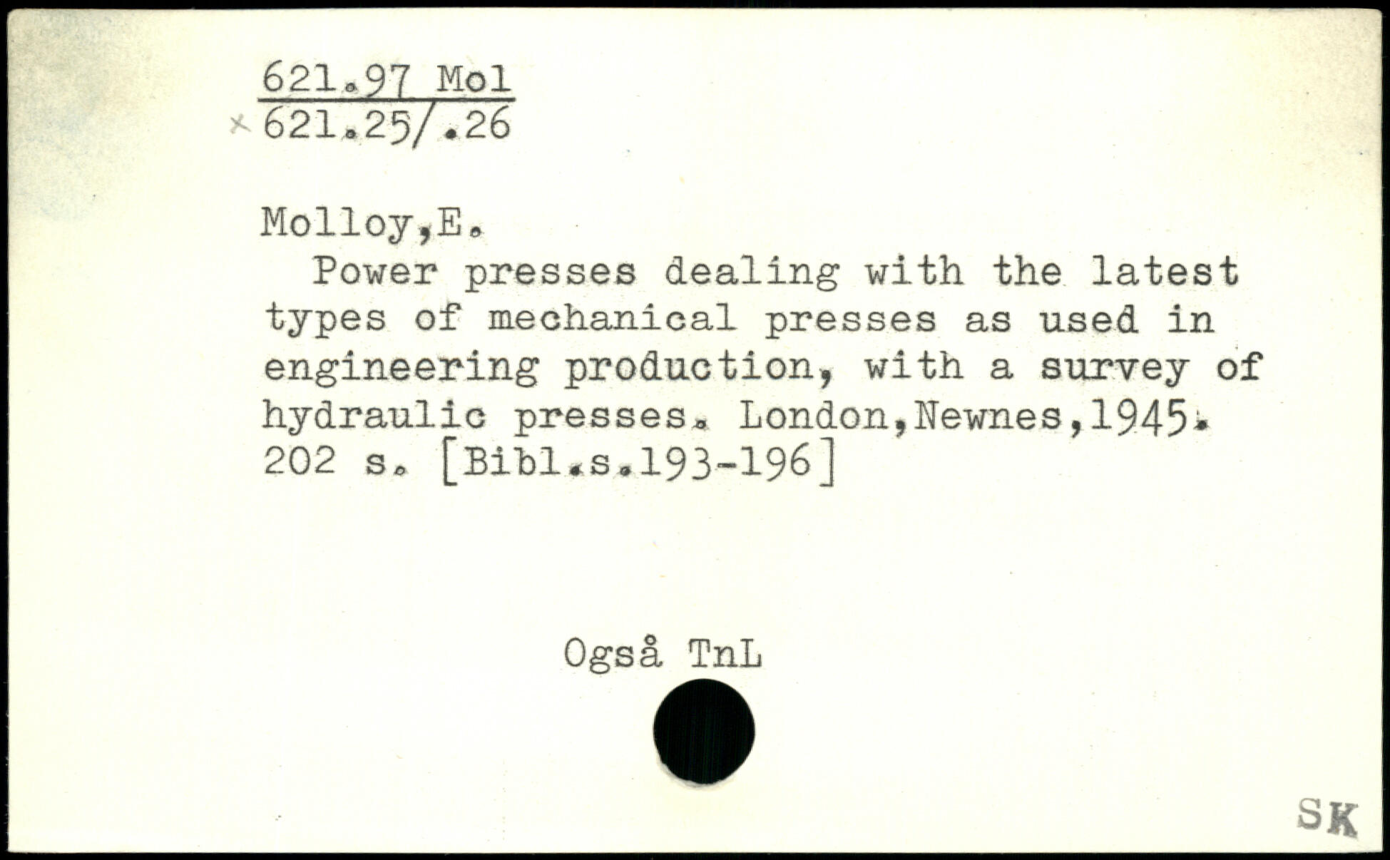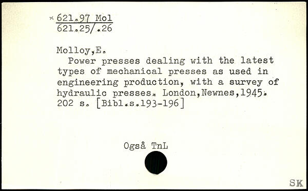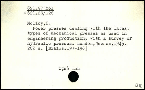 Power presses dealing with the latest types of mechanical presses as used in engineering production, with a survey of hydraulic presses.