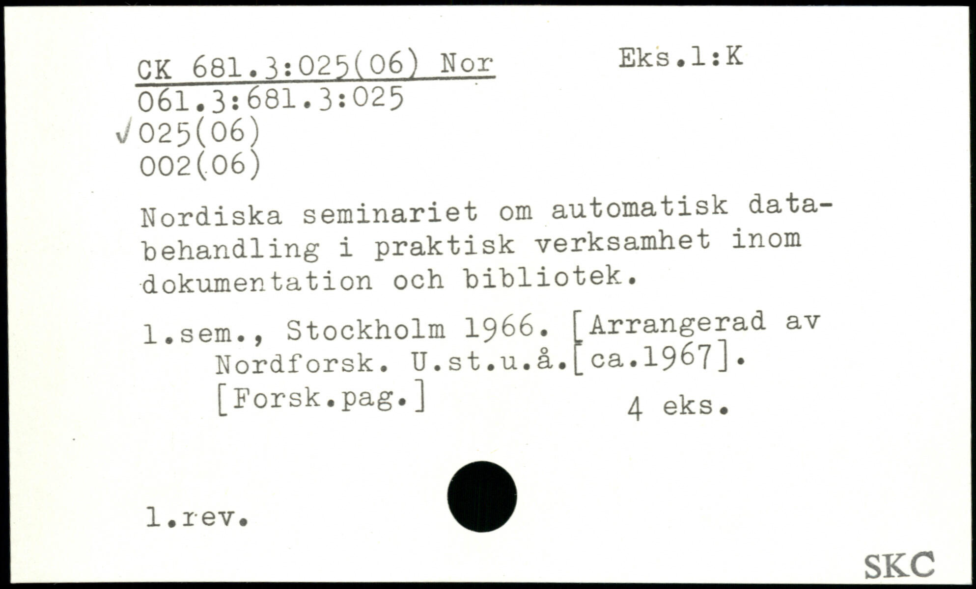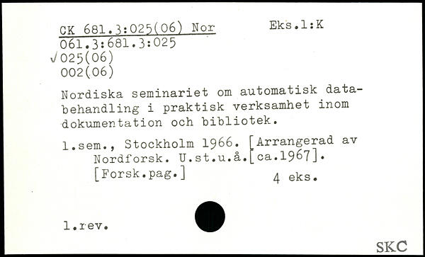 Nordiska seminariet om automatisk databehandling i praktisk verksamhet inom dokumentation och bibliotek. 1.sem.