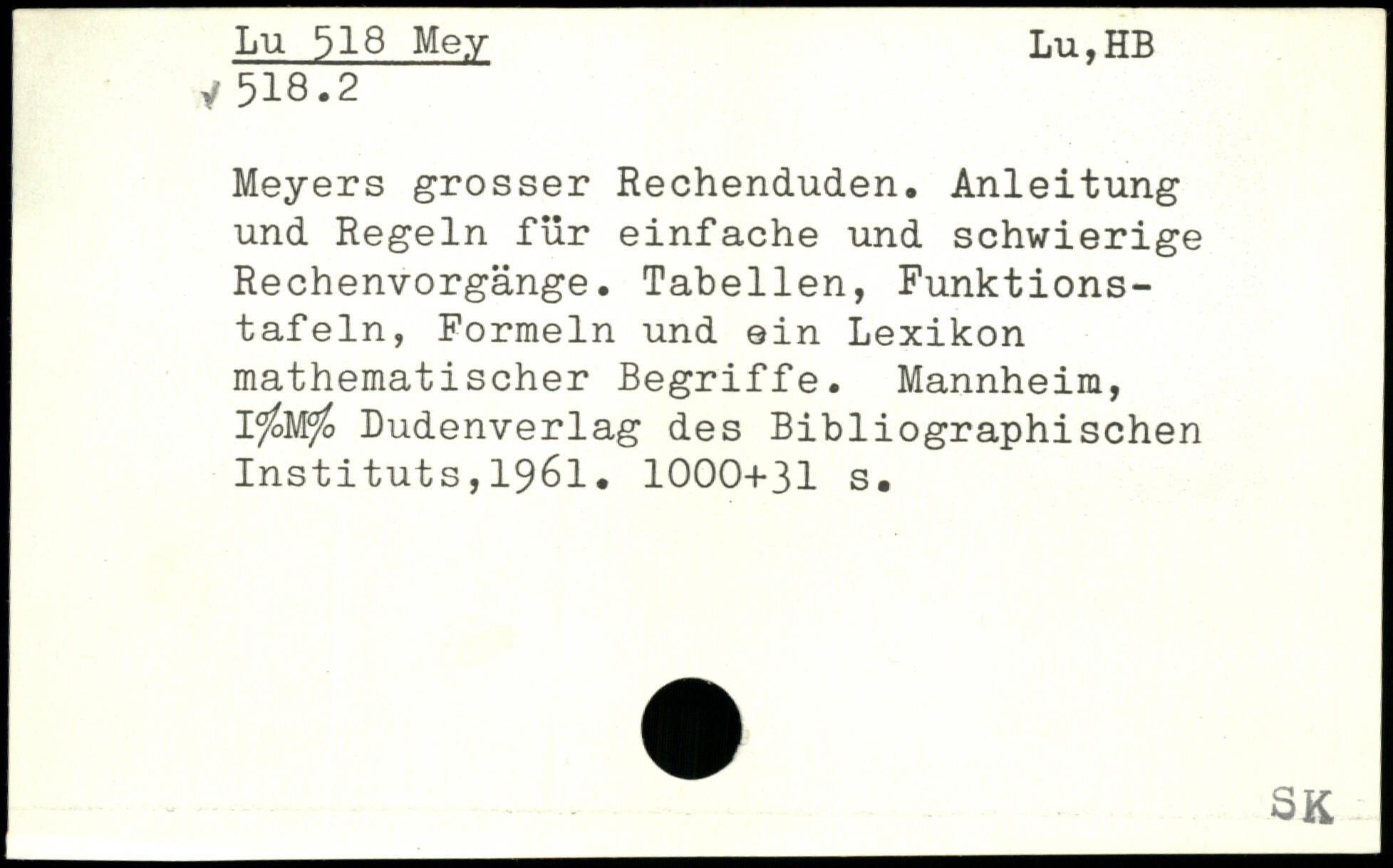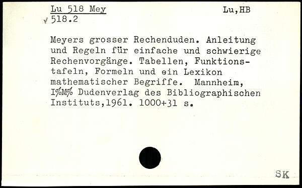 Meyers grosser Rechenduden. Anleitung und Regeln für einfache und schwierige Rechenvorgänge. Tabellen, Punktionstafeln, Formeln und ein Lexikon mathematischer Begriffe. Mannheim, I^M^ Dudenverlag des Bibliographischen Instituts,1961.