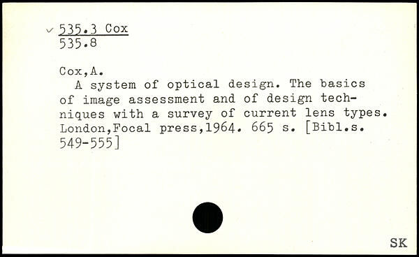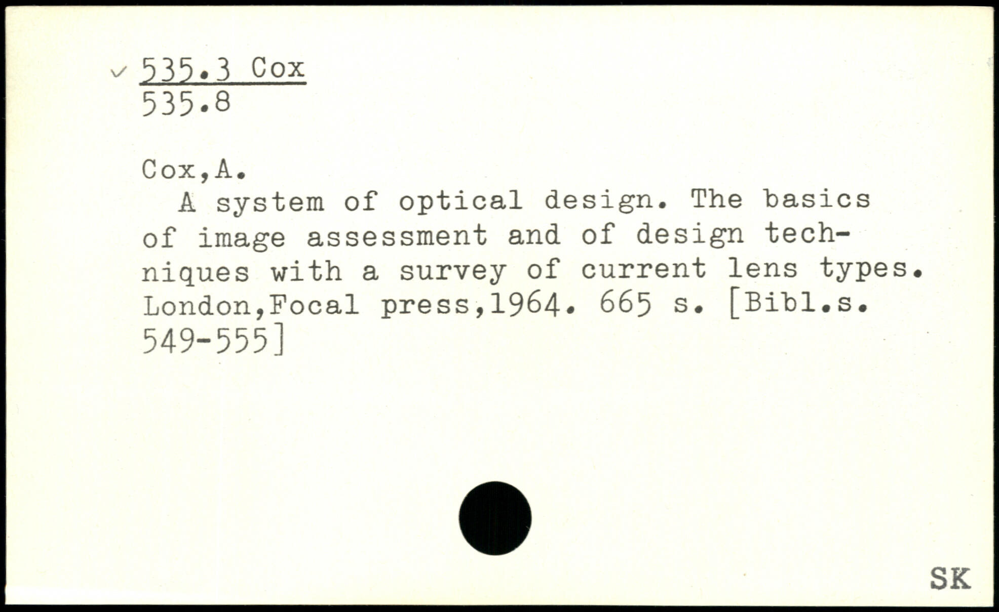 A system of optical design. The basics of image assessment and of design techniques with a survey of current lens types.