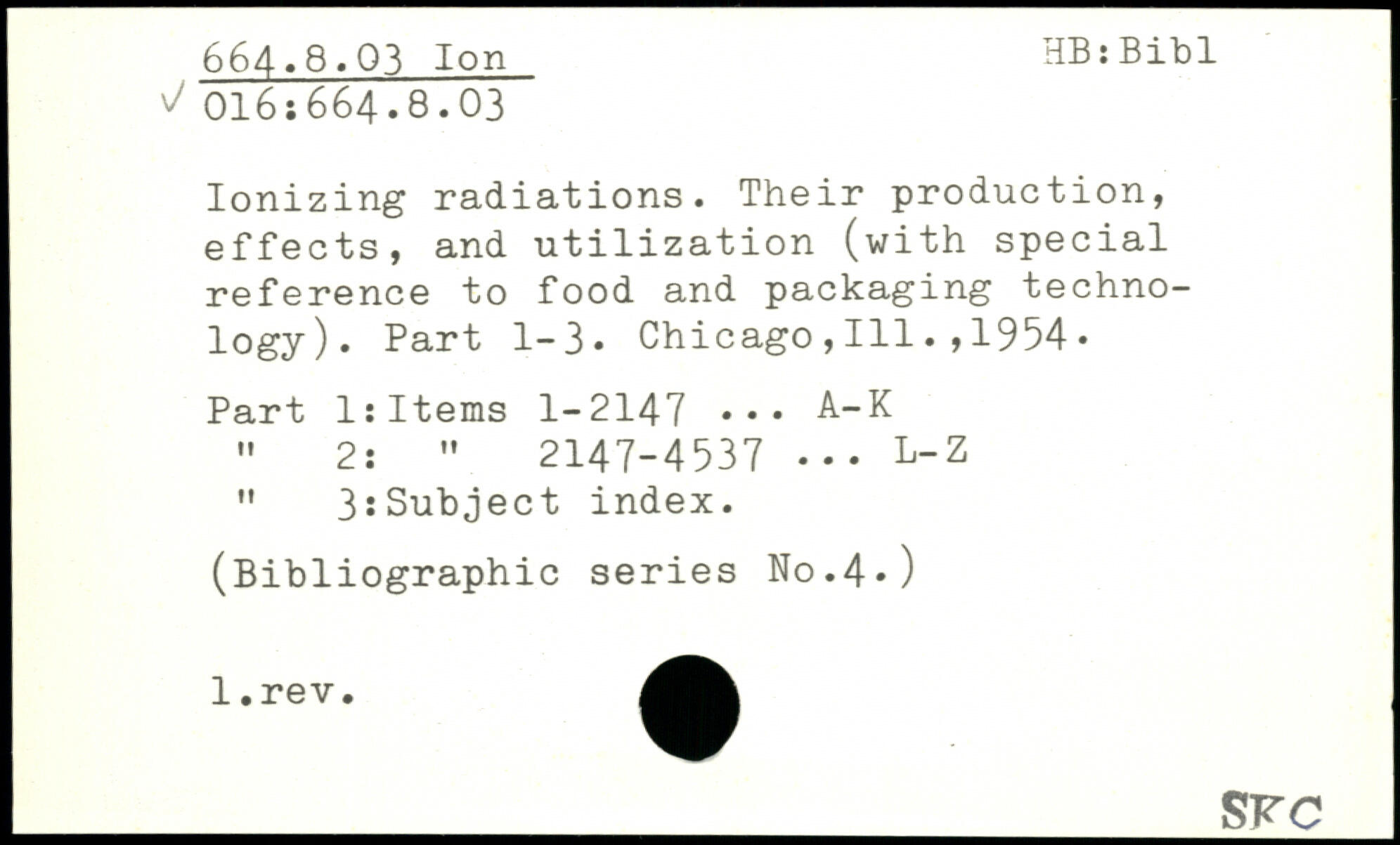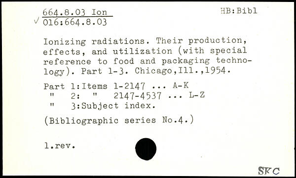 Ionizing radiations. Their production, effects, and utilization (with special reference to food and packaging technology). Part 1-3. Chicago,111.,1954. Part 1:Items 1-2147 ... A-K " 2: " 2147-4537 ... L-Z " 3:Subject index.