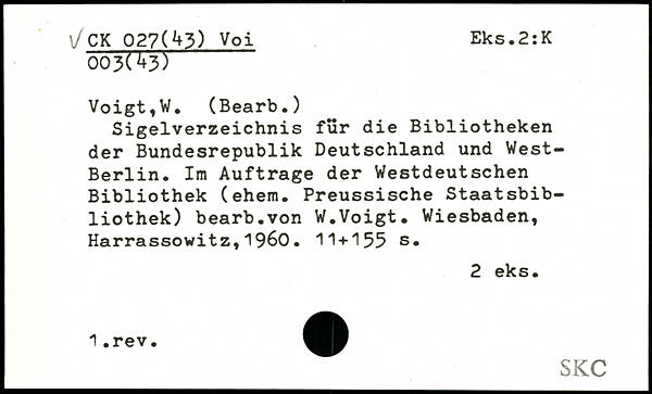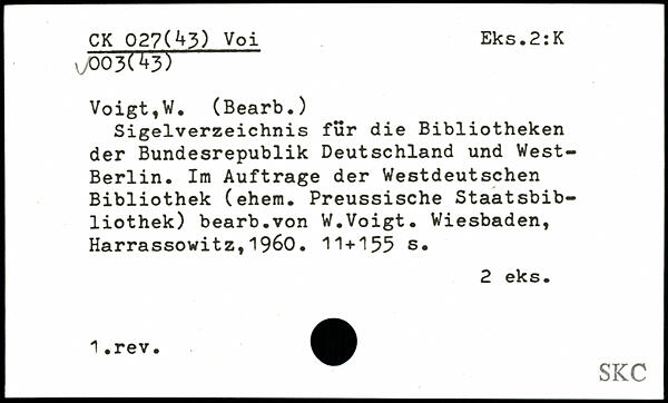 Sigelverzeichnis für die Bibliotheken der Bundesrepublik Deutschland und West-Berlin. Im Aufträge der Westdeutschen Bibliothek (ehern. Preussische Staatsbibliothek) bearb.von W.Voigt.