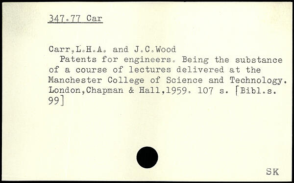 Carr?LoHoA0 and JcGo Wood Patents for engineers, Being the substance of a course of lectures delivered at the Manchester College of Science and Technology.