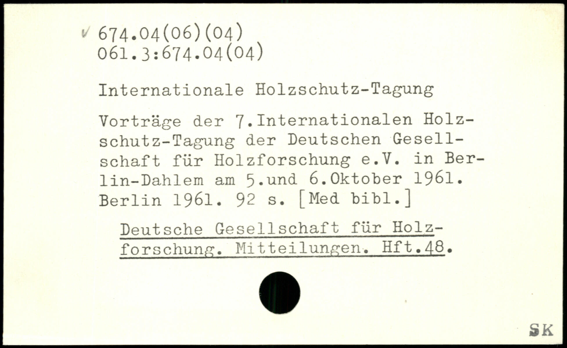 Internationale Holzschutz-Tagung Vorträge der 7.Internationalen Holz-schut z-Tagung der Deutschen Gesellschaft für Holzforschung e.V. in Berlin-Dahlem am 5.un(t 6. Oktober 1961.