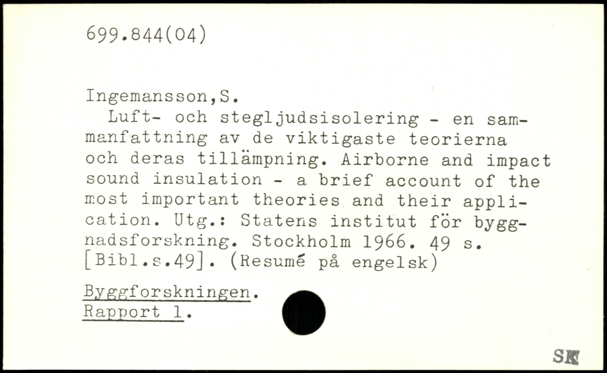 Luft- och stegljudsisolering - en sammanfattning av de viktigaste teorierna och deras tillämpning. Airborne and impact sound insulation - a brief account of the most important theories and their appli-cation. Utg.: Statens institut för bygg-nadsf orskning.