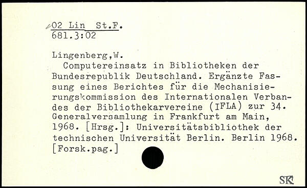 Computereinsatz in Bibliotheken der Bundesrepublik Deutschland. Ergänzte Fassung eines Berichtes für die Mechanisierungskommission des Internationalen Verbandes der Bibliothekarvereine (iFLA) zur 34, Generalversamlung in Frankfurt am Main, 1968. [Hrsg.]: Universitätsbibliothek der technischen Universität Berlin.