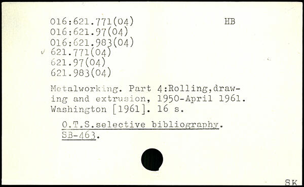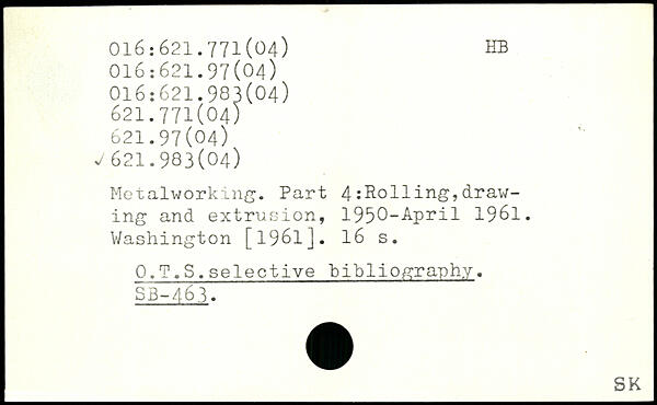 Metalworking. Part 4:Rolling,drawing and extrusion, 1950-April 1961.