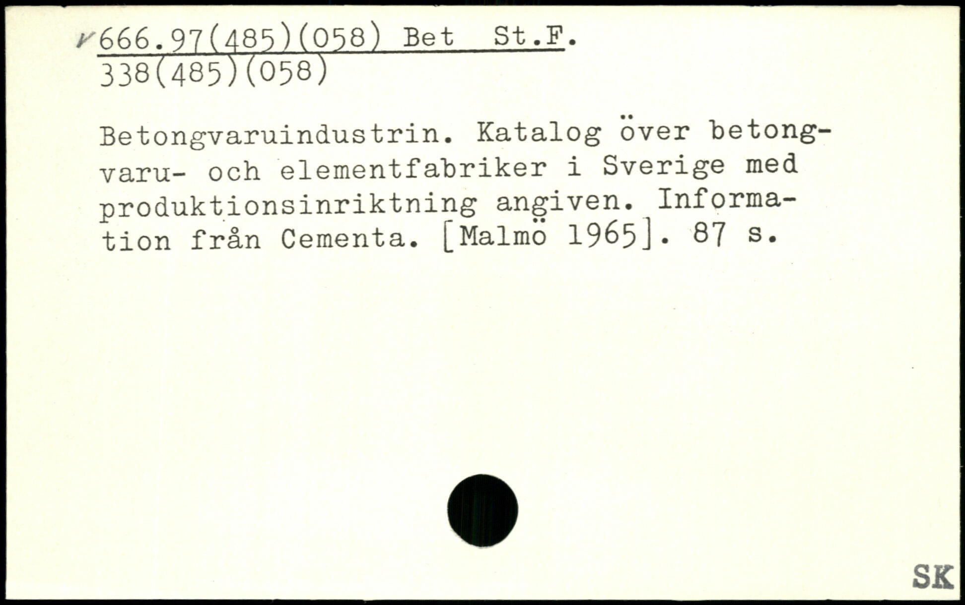 Betongvaruindustrin. Katalog over betongvärn- och elementfabriker i Sverige med produktionsinriktning angiven. Information från Cementa.