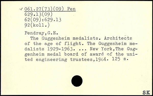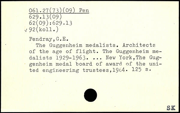 The Guggenheim medalists. Architects of the age of flight. The Guggenheim medalists 1929-1963. ... New York,The Guggenheim medal hoard of award of the united engineering trustees,1964.