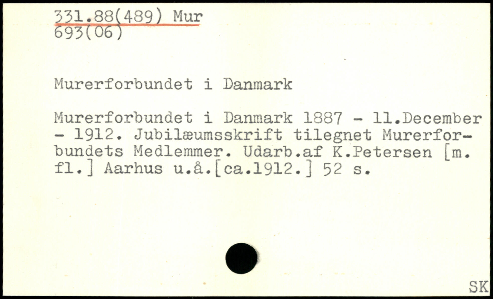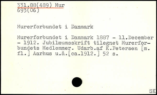 Murerforbundet i Danmark 1387 - 11.December - 1912. Jubilæumsskrift tilegnet Murerforbundets Medlemmer. Udarb.af K.Petersen [m. fl.] Aarhus u.å.[ca.1912.]