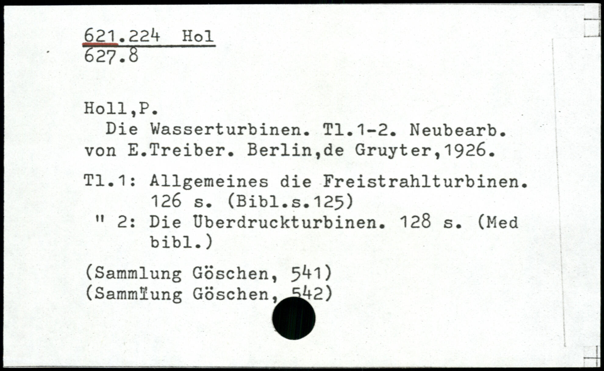 Die Wasserturbinen. TI.1-2. Neubearb. von E.Treiber. Berlin,de Gruyter,1926. TI.1s Allgemeines die Freistrahlturbinen.