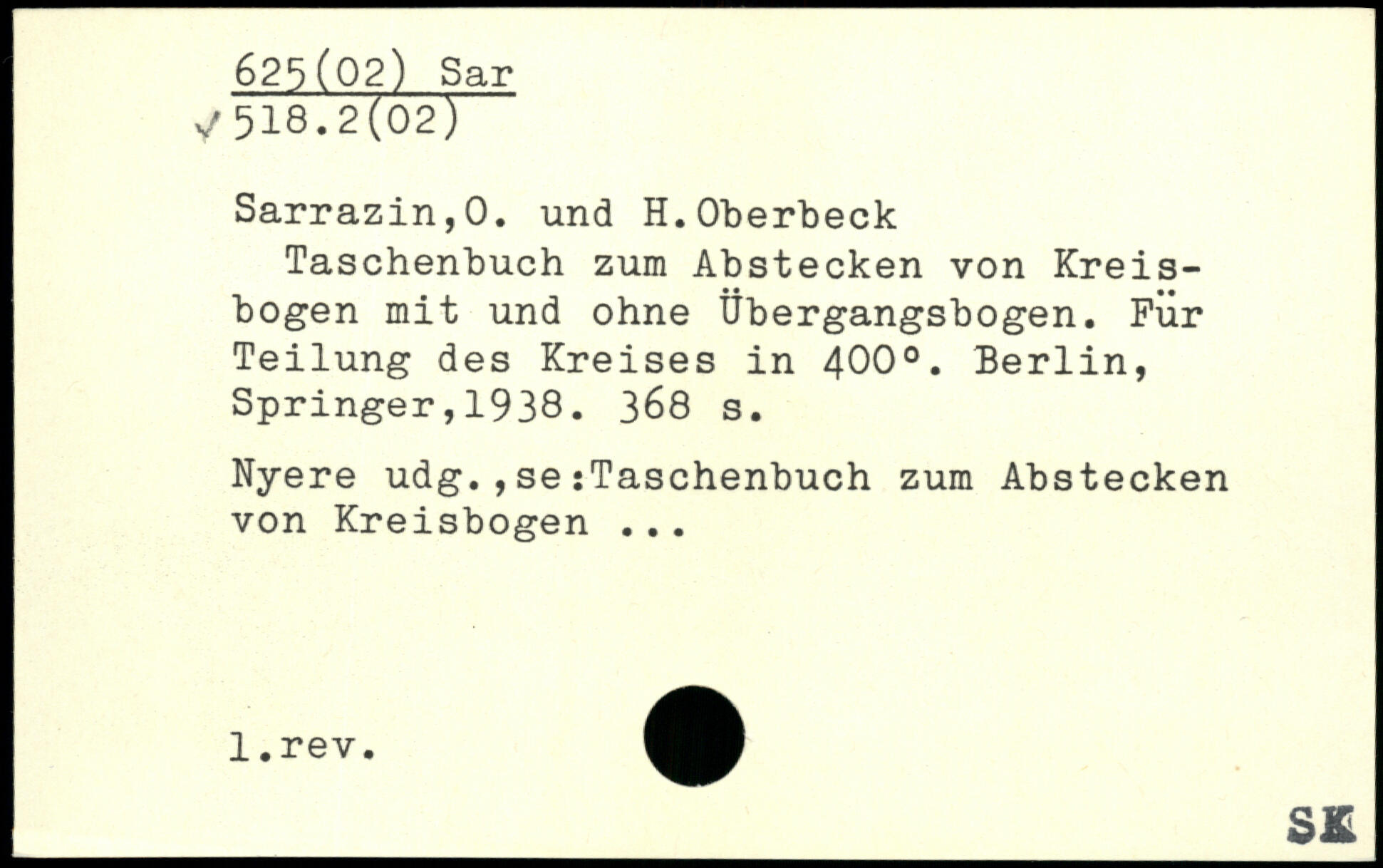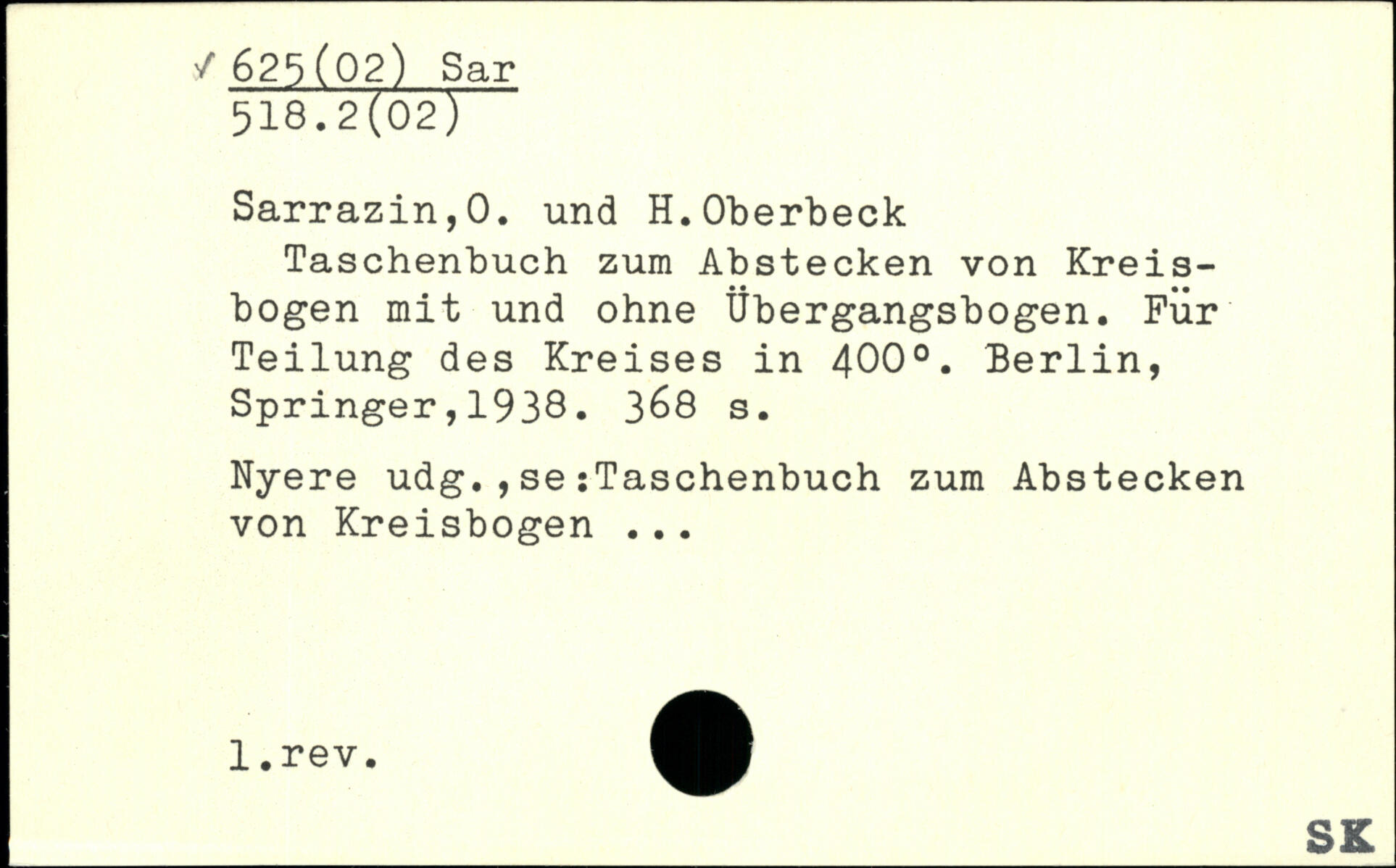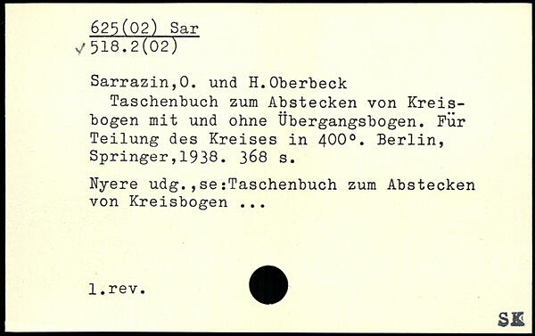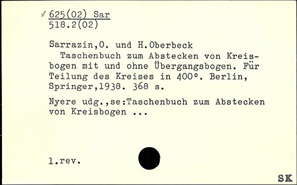 Taschenbuch zum Abstecken von Kreisbogen mit und ohne Übergangsbogen. Für Teilung des Kreises in 400..