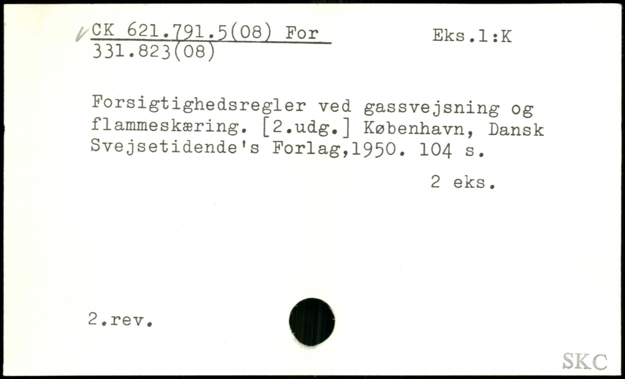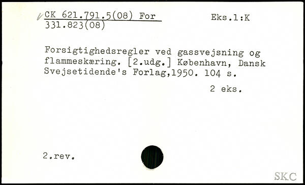 Forsigtighedsregler ved gassvejsning og flammeskæring. [2,udg.] København, Dansk Svejsetidende's Forlag,1950.