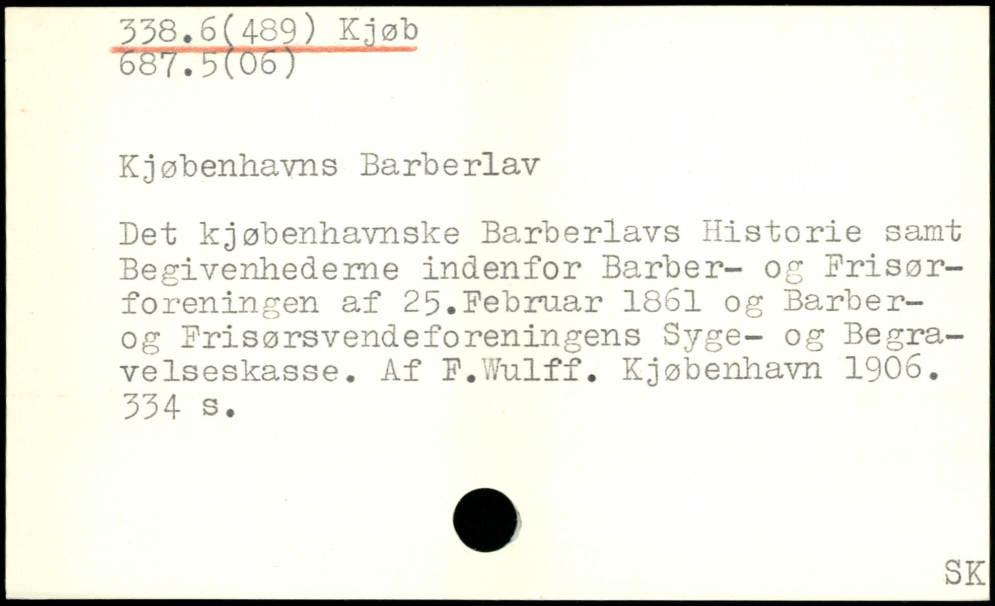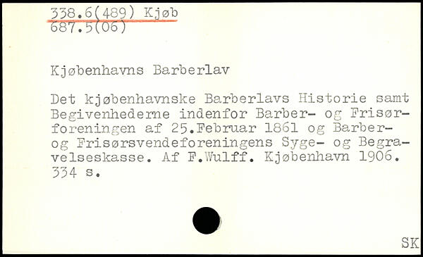 Kjøbenhavns Barberiav Det kjøbenhavnske Barberlavs Historie samt Begivenhederne indenfor Barber- og Krisørforeningen af 25.Februar 1861 og Barber-og Frisørsvendeforeningens Syge- og Begravelseskasse, Af F.Wulff. Kjøbenhavn 1906.