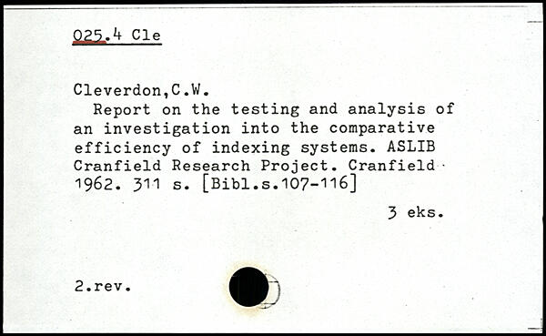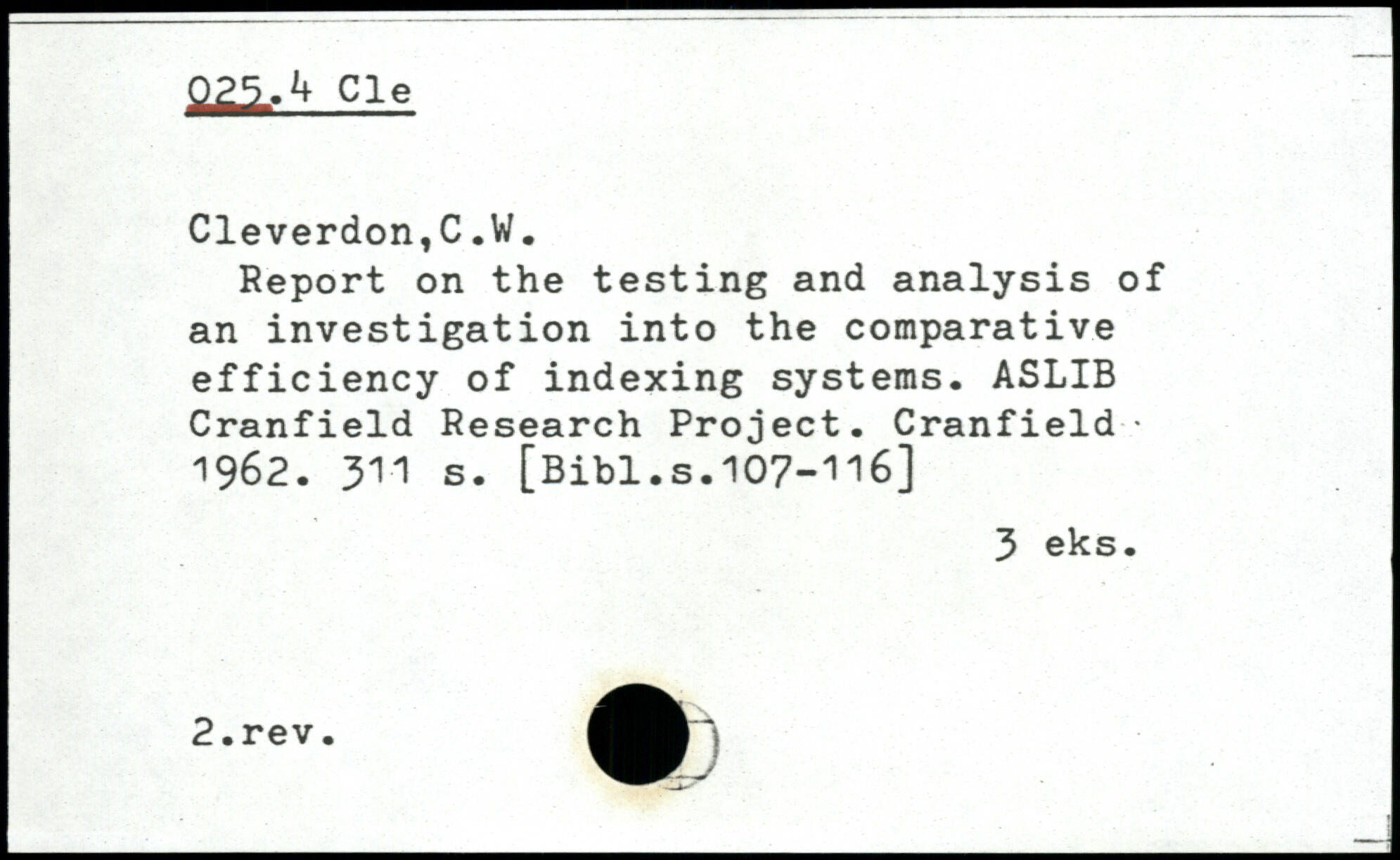 025.^ Cle Cleverdon,C.W. Report on the testing and analysis of an investigation into the comparative efficiency of indexing systems. ASLIB Cranfield Research Project. Cranfield-1962.