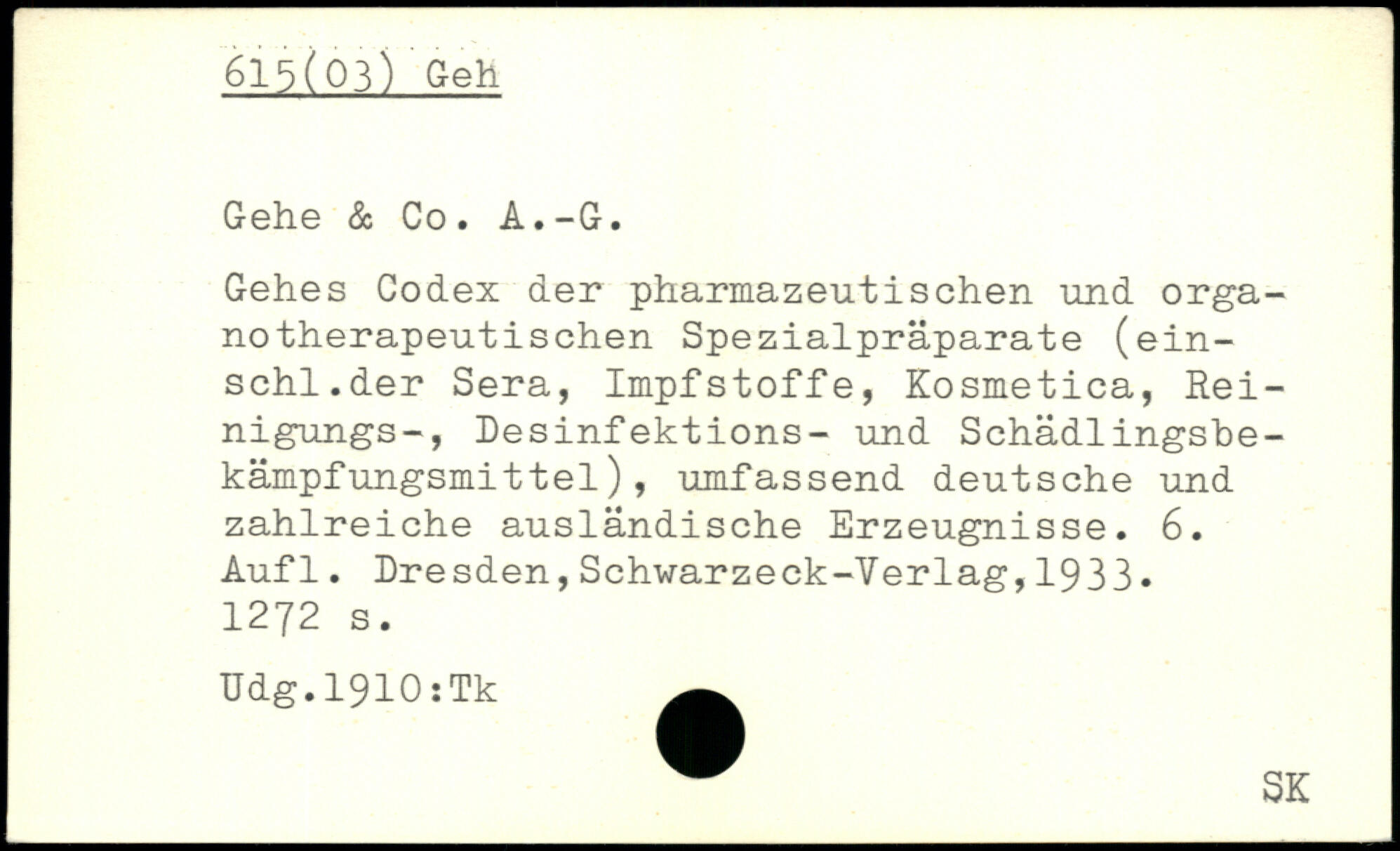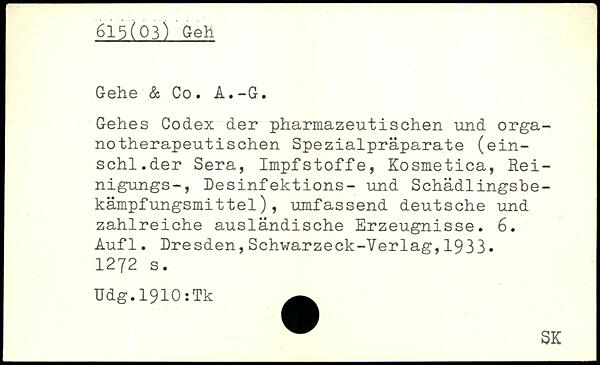 Gehes Codex der pharmazeutischen und orga-notherapeutischen Spezialpräparate (ein-schl.der Sera, Impfstoffe, Kosmetica, Rei-nigungs-, Desinfektions- und Schädlingsbekämpf ungsmit tel ) , umfassend deutsche und zahlreiche ausländische Erzeugnisse.