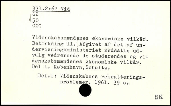 Videnskabsmandenes økonomiske vilkår. Betænkning II. Afgivet af det af undervisningsministeriet nedsatte udvalg vedrørende de studerendes og videnskabsmændenes økonomiske vilkår. Del 1. København,Schultz. Del.l: Videnskabens rekrutterings-problem^^ 1961.