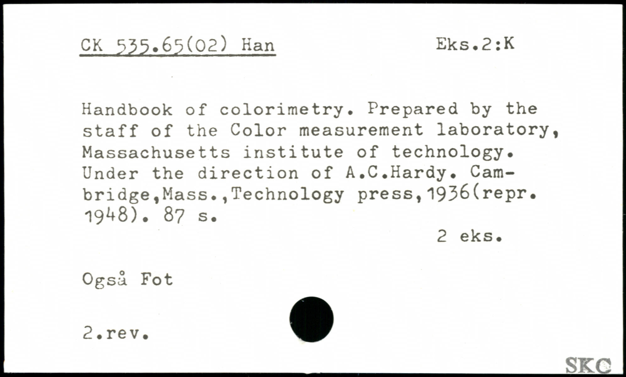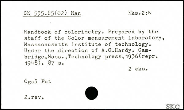 Handbook of colorimetry. Prepared by the staff of the Color measurement laboratory, Massachusetts institute of technology. Under the direction of A.C.Hardy.