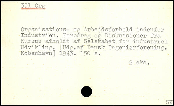 Organisations- og Arbejdsforhold indenfor Industrien. Foredrag og Diskussioner fra Kursus afholdt af Selskabet.for industriel Udvikling.