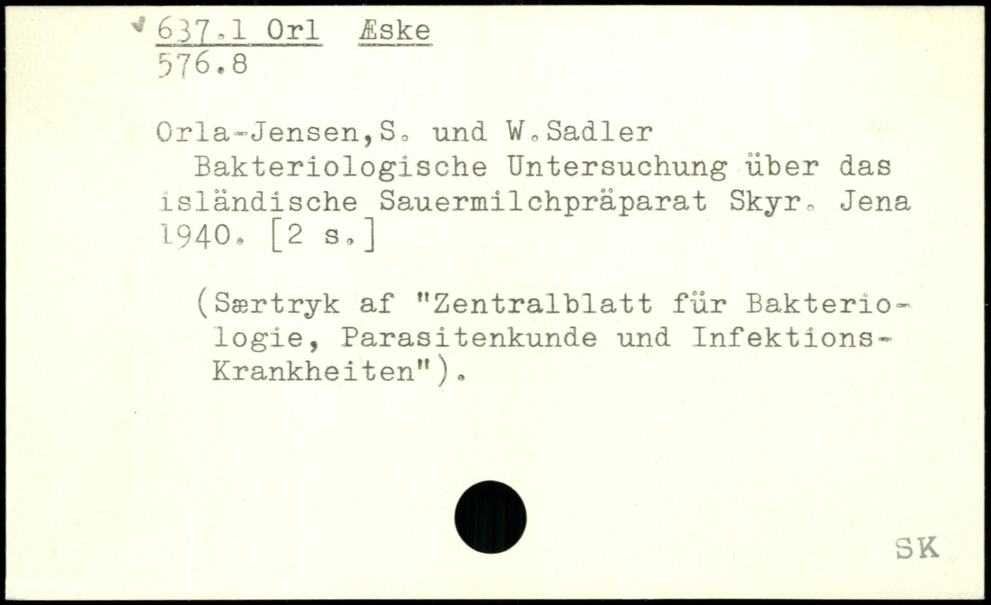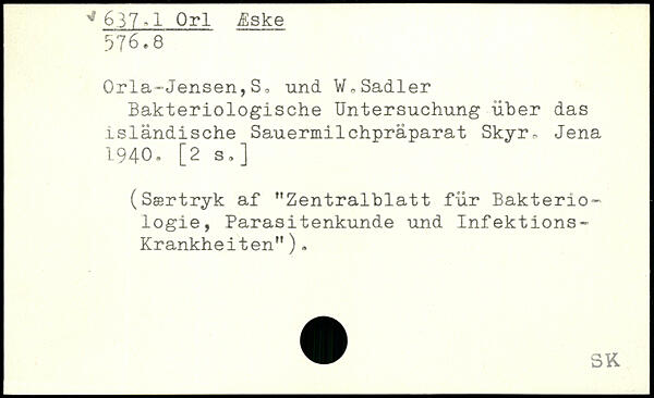 Orla-Jensen,S, und W,Sadler Bakteriologische Untersuchung über das isländische Sauermilchpräparat Skyr, Jena 1940. [2 3.] (Særtryk af "Zentralblatt für Bakterio-logie, Parasitenkunde und Infektions-Krankheiten" ).