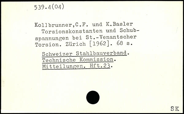 Kollbrunner,C.F. und K.Basler Torsionskonstanten und Schubspannungen "bei St.-Venant scher Torsion. Zürich [1962].