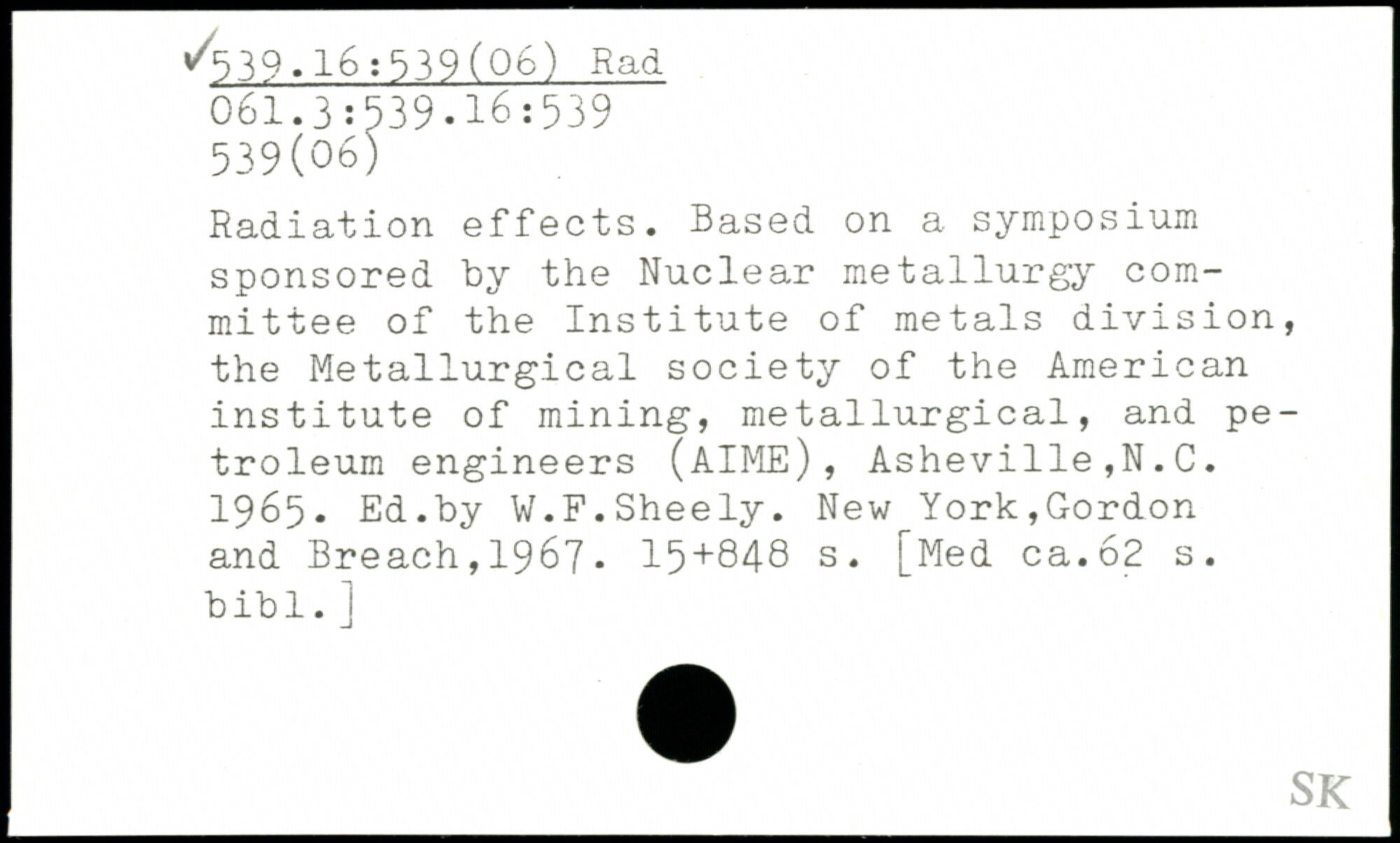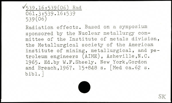 Radiation effects. Based on a symposium sponsored by the Nuclear metallurgy committee of the Institute of metals division, the Metallurgical society of the American institute of mining, metallurgical, and petroleum engineers (AIME), Asheville,N.C. 1965. Ed.by W.F.Sheely.
