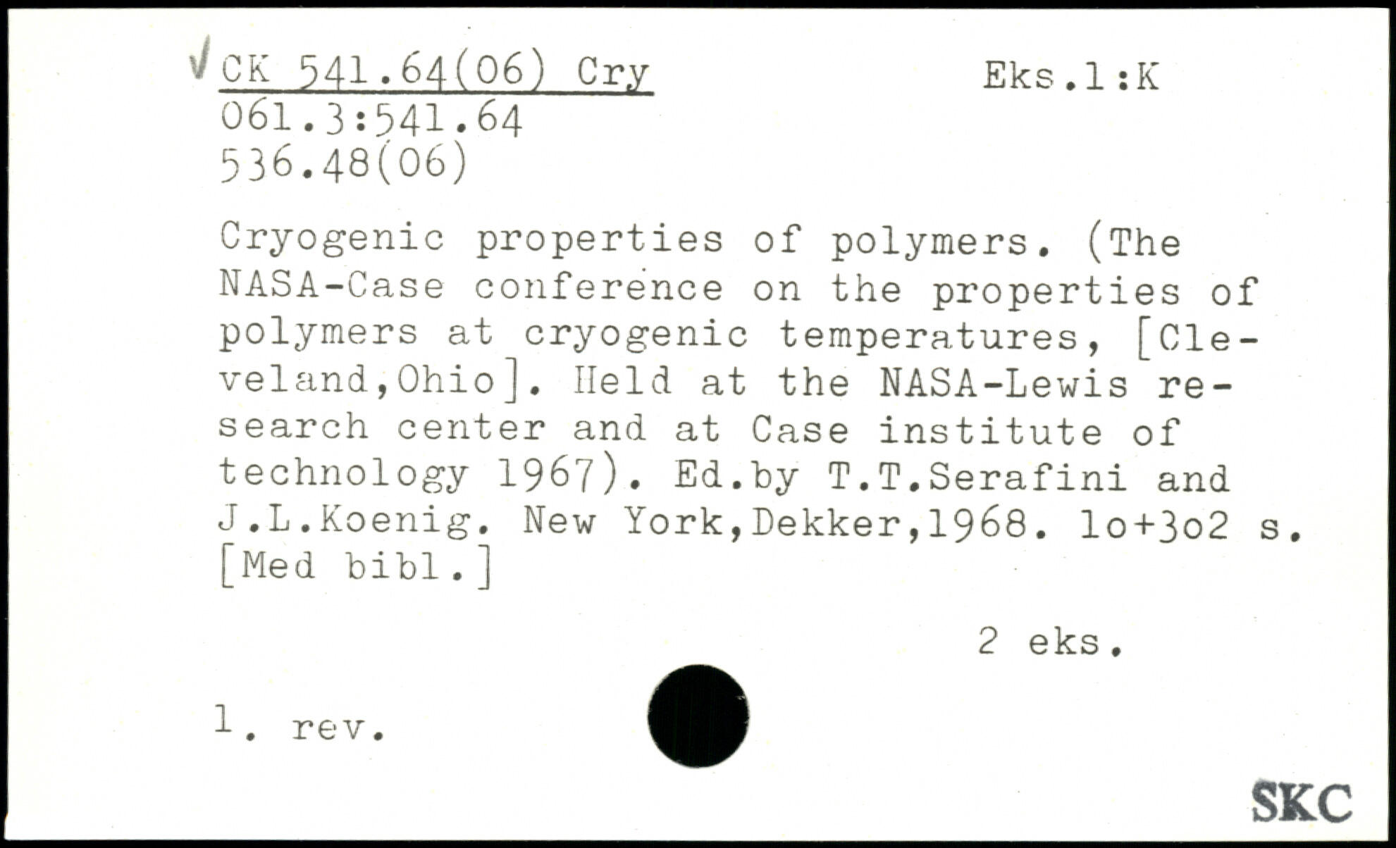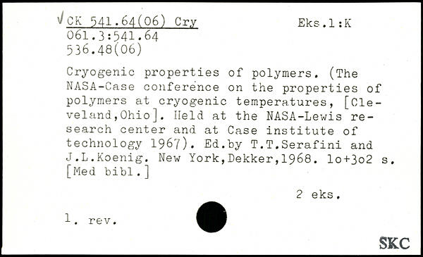 Cryogenic properties of polymers. (The NASA-Case coiiference on the properties of polymers at cryogenic temperatures, [Cleveland , Ohio ]. Held at the NASA-Lewis research center and at Case institute of technology 1967). Ed.by T.T.Serafini and J.L.Koenig.