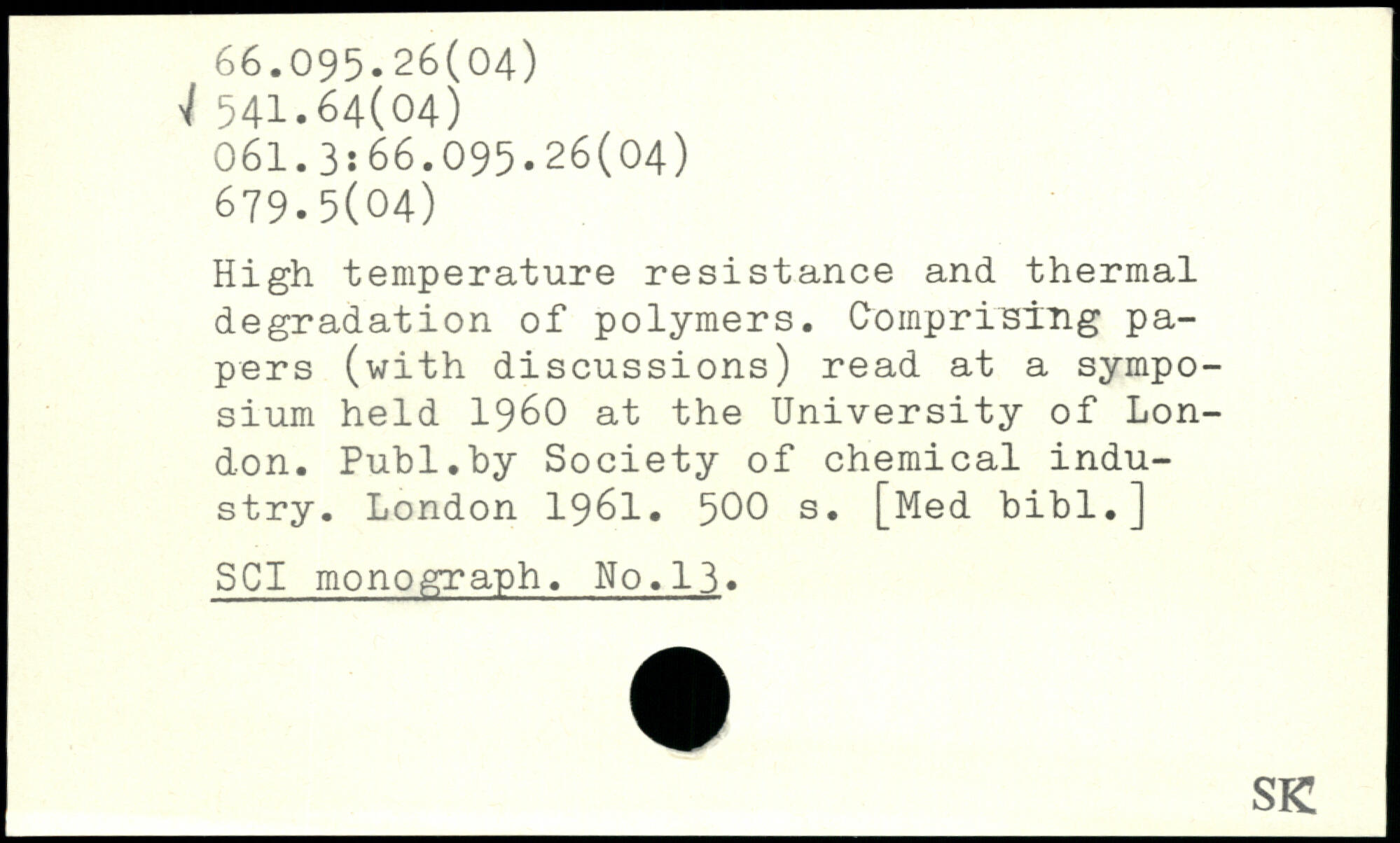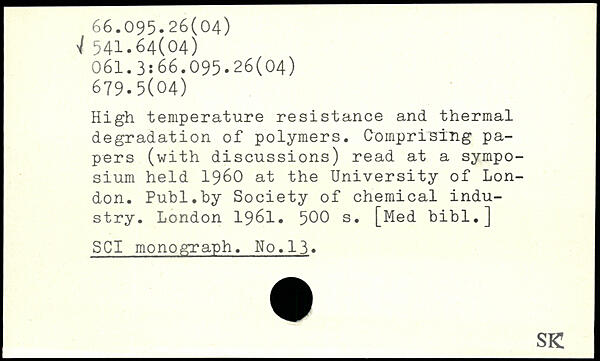 High temperature resistance and thermal degradation of polymers. Comprising papers (with discussions) read at a symposium held 1960 at the University of London.
