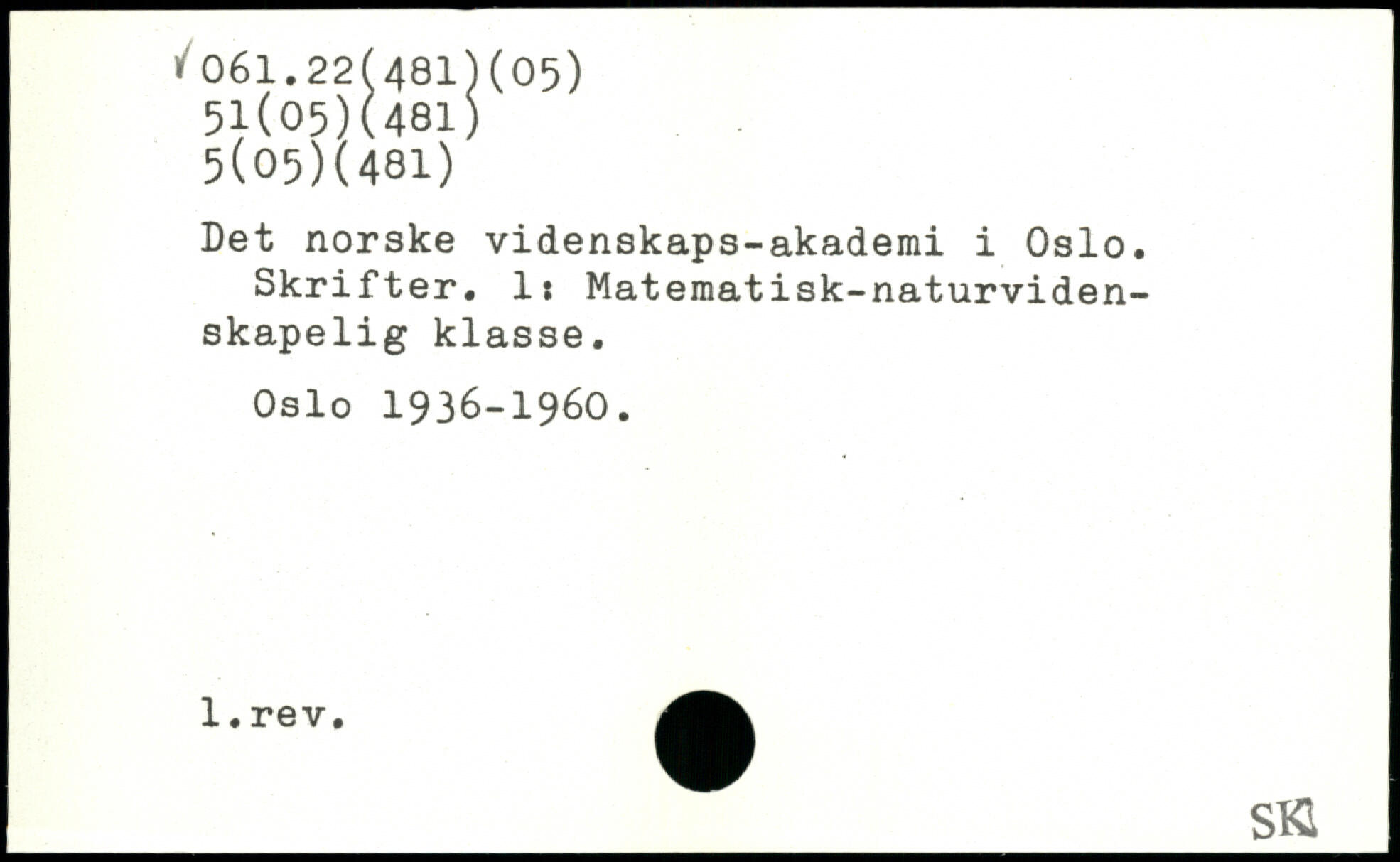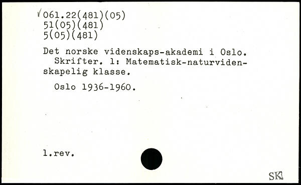 Det norske videnskaps-akademi i Oslo. Skrifter. Is Matematisk-naturviden-skapelig klasse. Oslo 1936-1960.