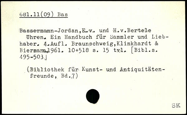 Basse-rmainn^Jordan,und H.. v.Bertele Uhren. Ein Handbuch für Sammler und Liebhaber.