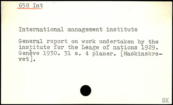 International management institute General report on work undertaken by the institute for the Leage of nations 1929. Geneve 1930