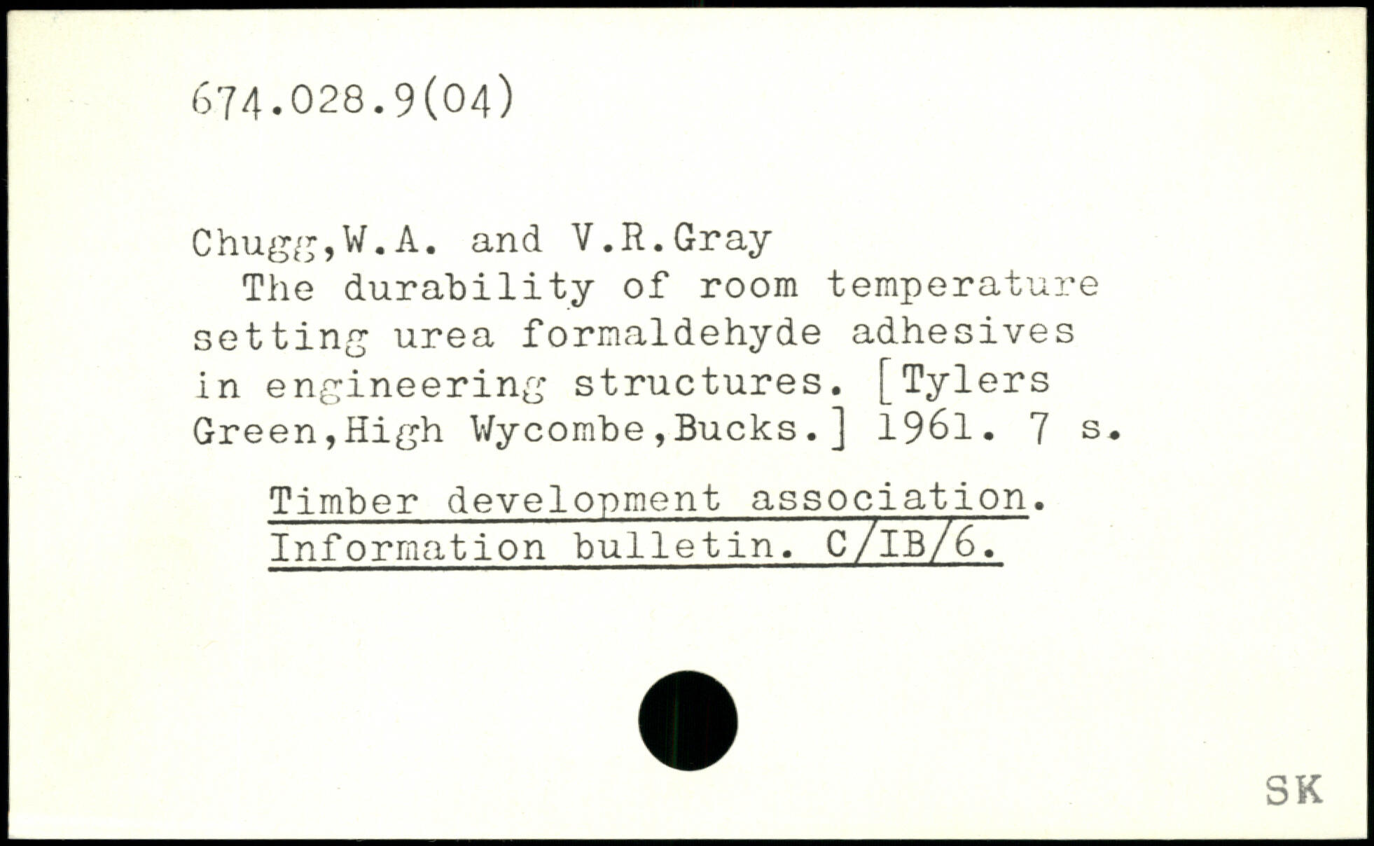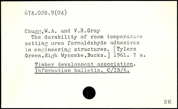 The durability of room temperature setting urea formaldehyde adhesives in engineering structures. [Tylers Green,High Wycombe,Bucks.] 1961.