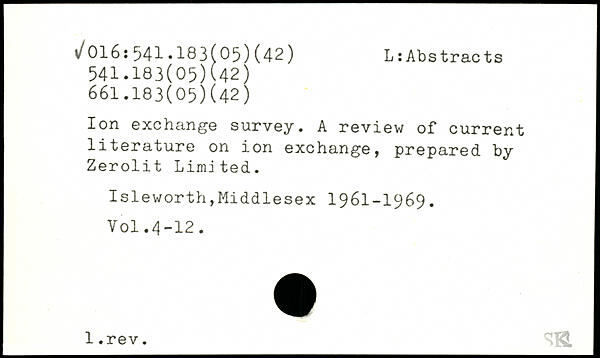 Ion exchange survey. A review of current literature on ion exchange, prepared by Zerolit Limited. Isleworth,Middlesex 1961-1969.