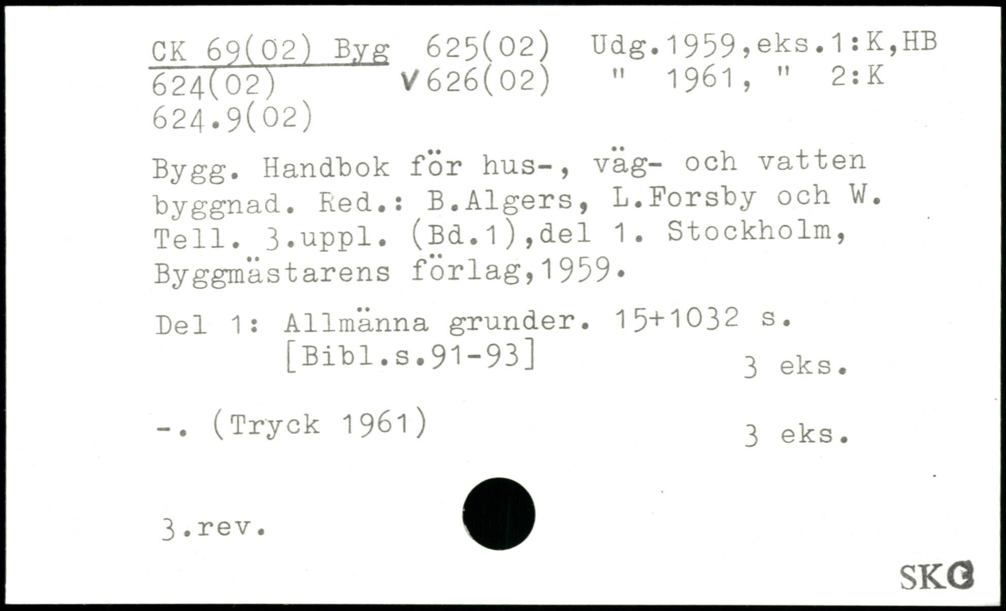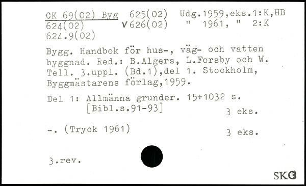 1961, " 2:K 624.9(02) Bygg. Handbok for hus-, vag- och vatten byggnad. Red.: B.Algers, L.Forsby och W. Tell.