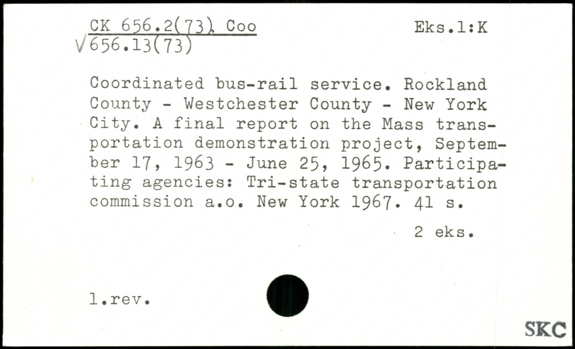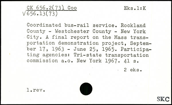 Coordinated bus-rail service. Rockland County - Westchester County - New York City. A final report on the Mass transportation demonstration project, September 17, 1963 - June 25, 1965. Participating agencies: Tri-state transportation commission a.o.