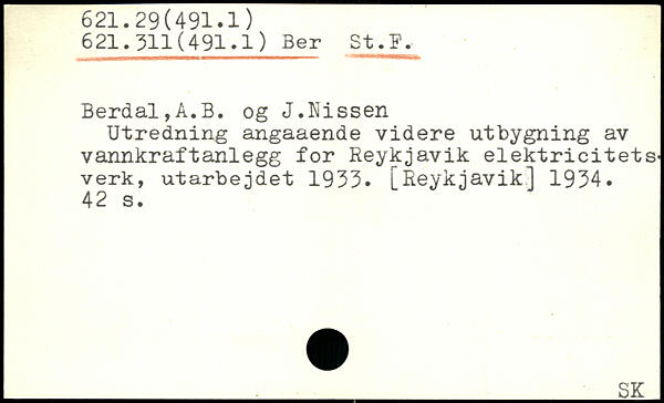 Utredning angaaende videre utbygning av vannkraftanlegg for Reykjavik elektricitets' verk, utarbejdet 1933. [Reykjavik] 1934.