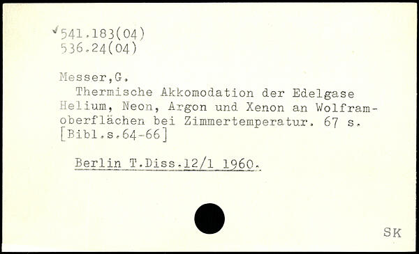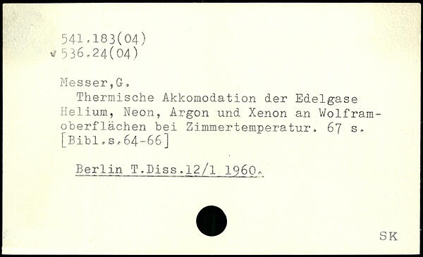 Thermische Akkomodation der Edelgase Helium, Neon, Argon und Xenon an Wolframoberflächen bei Zimmertemperatur