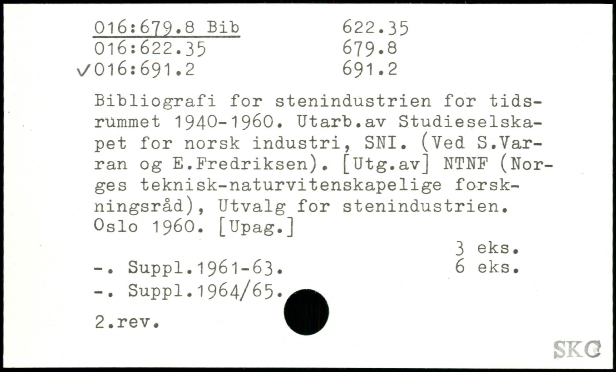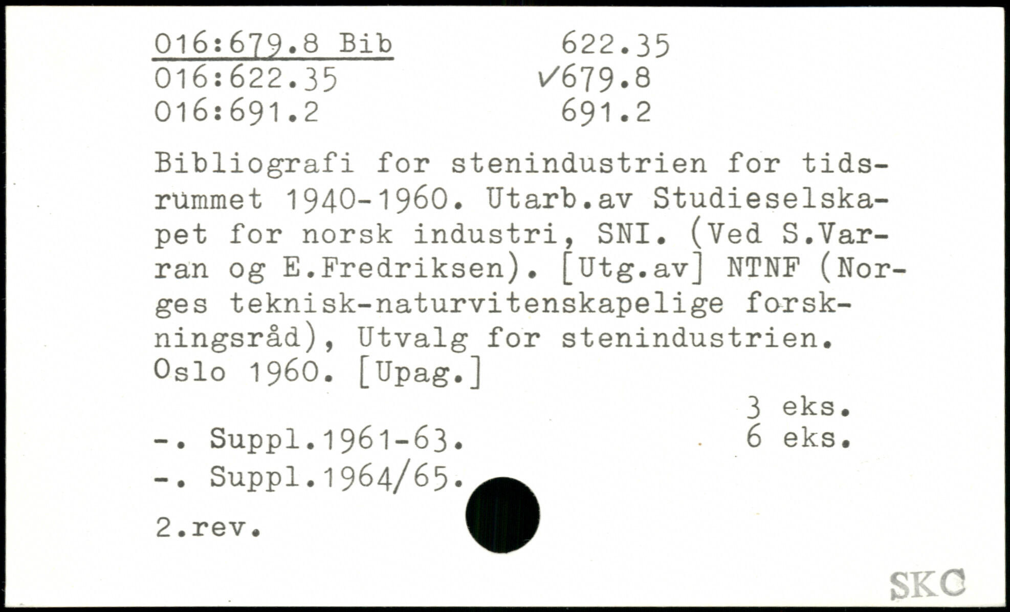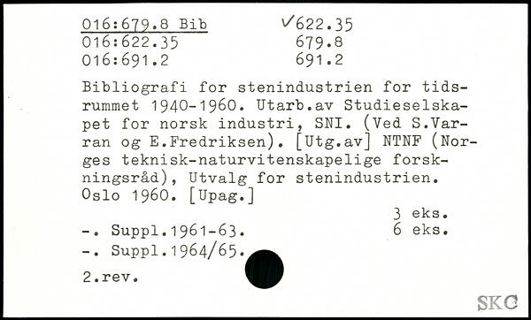 Bibliografi for stenindustrien for tidsrummet 1940-1960. Utarb.av Studieselska-pet for norsk industri, SNI. (Ved S.Var-ran og E.Fredriksen). [Utg.av] NTNF (Norges teknisk-naturvitenskapelige forskningsråd), Utvalg for stenindustrien. Oslo 1960. [Upag.]