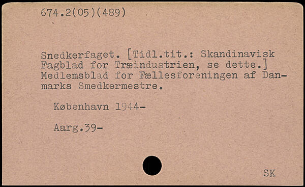 Snedkerfaget. [Tidl.tit.: Skandinavisk Fagblad for Træindustrien, se dette.] Medlemsblad for Fællesforeningen af Danmarks Smedkermestre.