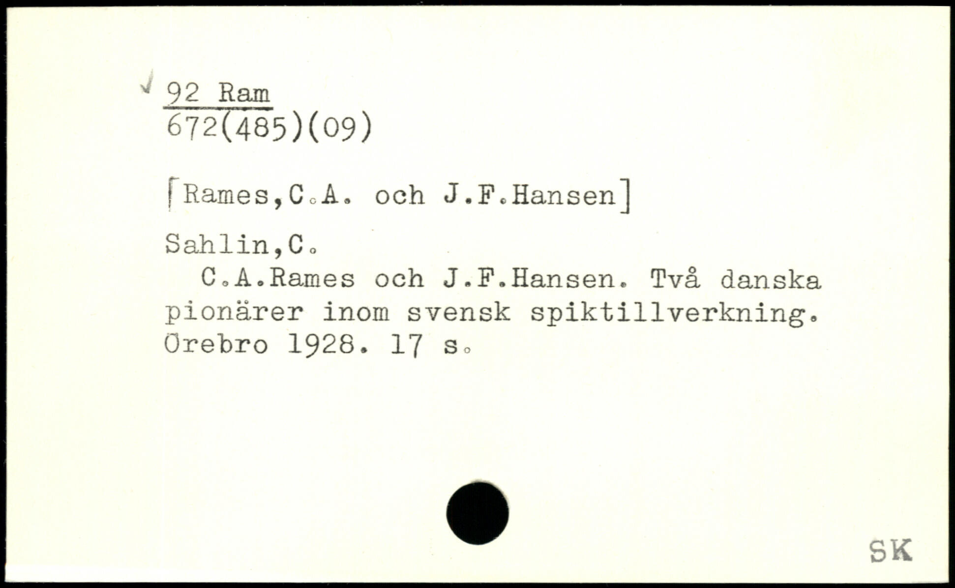 FRåmes,ChÅ. och J.F.Hansen] Sahlin,Co CoA.Rames och J.F.Hansen. Två danska pionarer inom svensk spiktillverkning, Örebro 1928.