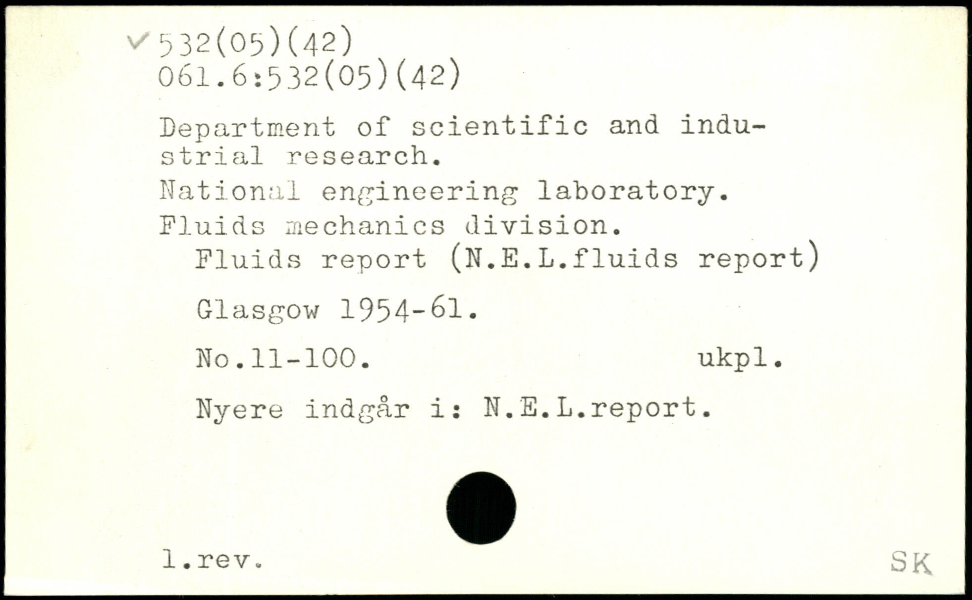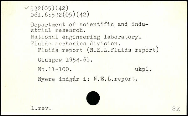 Department of scientific and industrial research. National engineering laboratory. Fluids mechanics division. Fluids report (N.E.L.fluids report) Glasgow 1954-61. No.11-100. ukpl. Nyere indgår i: N.E.L.report. l.rev. SK