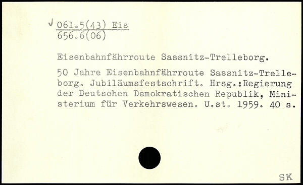Eisenbahnfährroute Sassnitz-Tr elleborg. 50 Jahre Eisenbahnfährroute Sassnitz-Trelleborg,, Jubiläumsfestschrifto Hrsg.:Regierung der Deutschen Demokratischen Republik, Ministerium für Verkehrswesen. U.st, 1959-