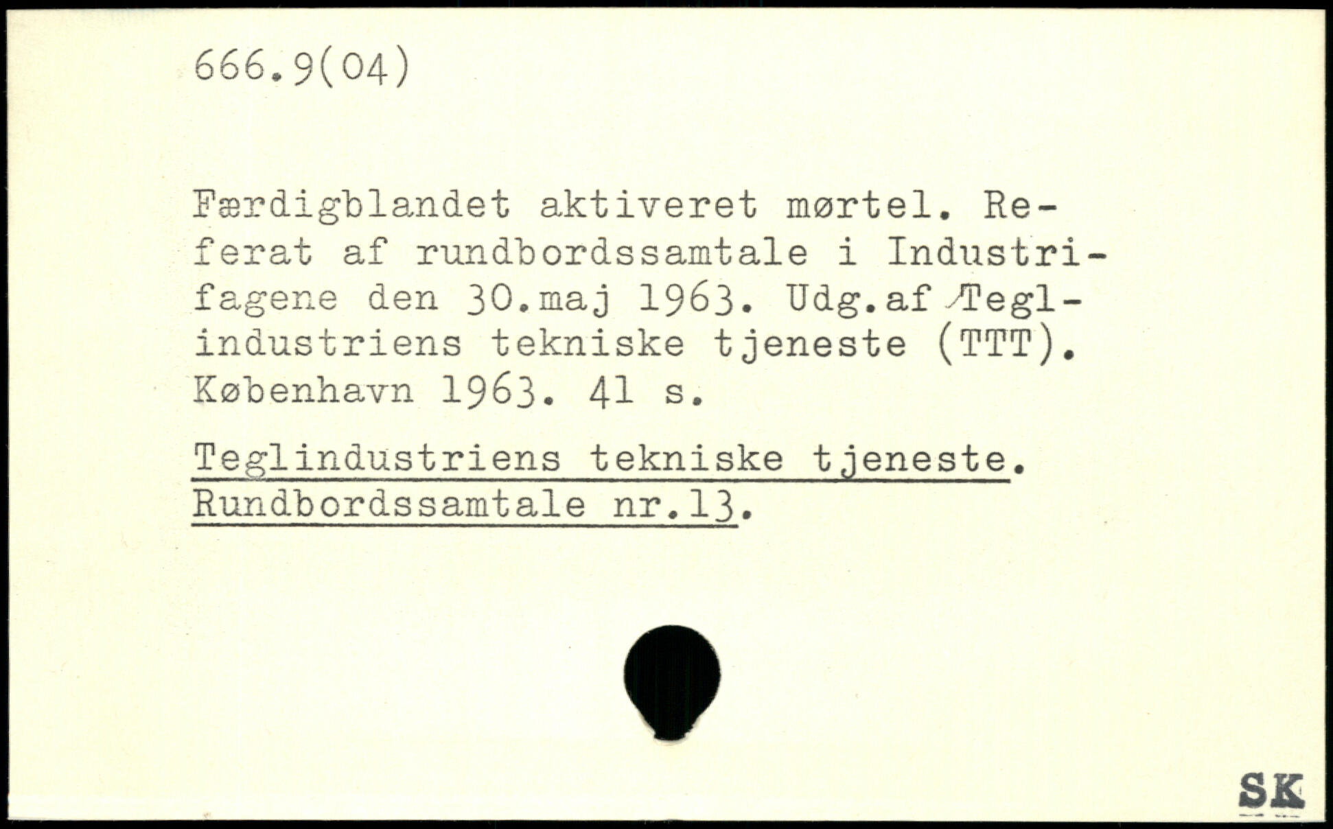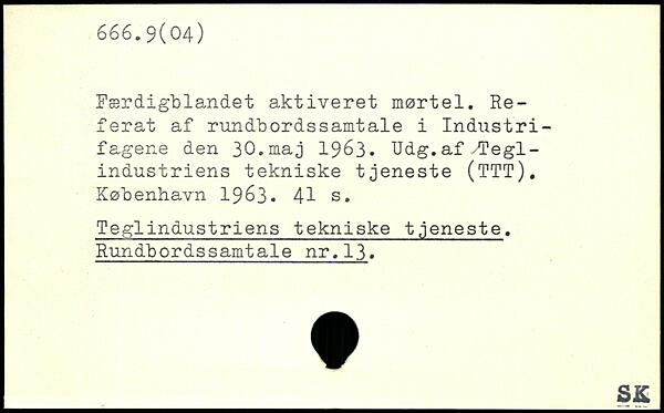 Færdigblandet aktiveret mørtel. Referat af rundbordssamtale i Industrifagene den 30.maj 1963. Udg.af/Tegl-industriens tekniske tjeneste (TTT).