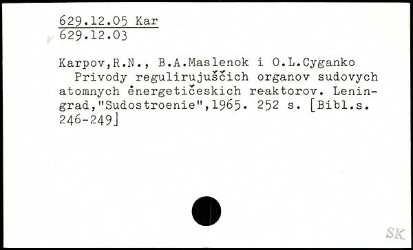 Karpov,R.N., B.A.Maslenok i O.L.Cyganko Privody regulirujuscich organov sudovych atomnych énergeticeskich reaktorov. Leningrad ,"Sudostroenie",19&5.