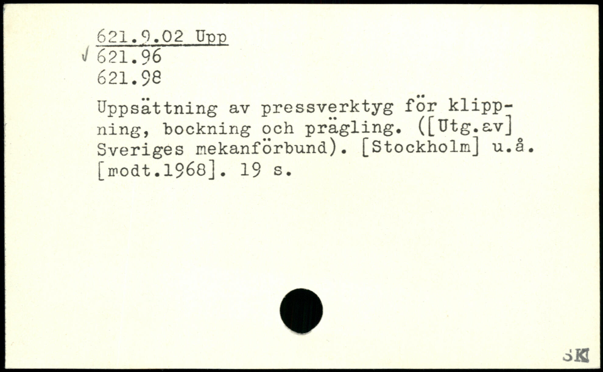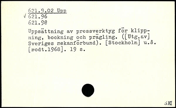 Uppsättning av pressverktyg for klippning, bockning och prägling. ([Utg.&v] Sveriges mekanförbund). [Stockholm] u.å. [modt.196ö].