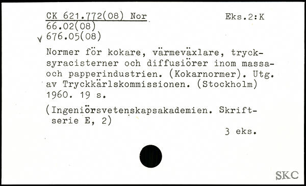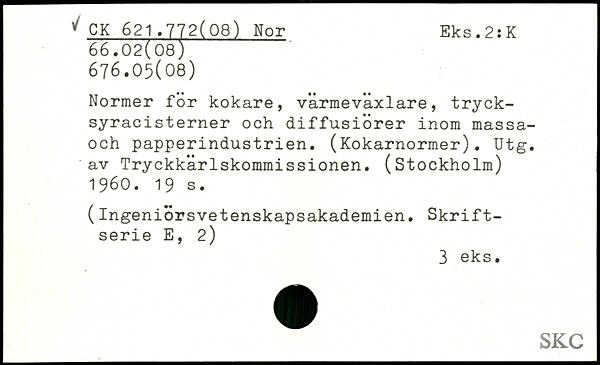 Normer for kokare, värmeväxlare, tryck-syracisterner och diffusiörer inom massa-och papperindustrien. (Kokarnormer). Utg. av Tryckkärlskommissionen. (Stockholm) 1960.