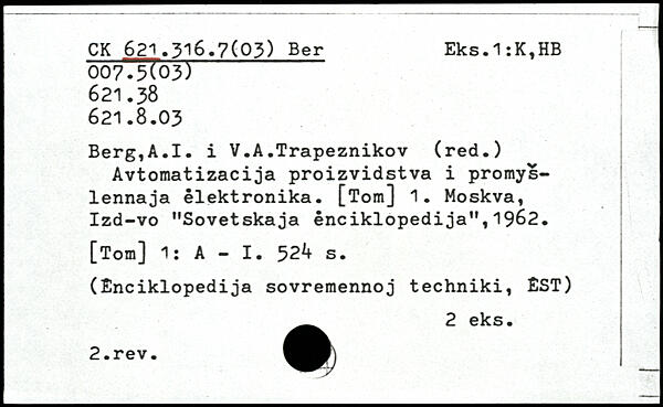 Avtomatizacija proizvidstva i promys-lennaja êlektronika. [Tom] 1. Moskva, Izd-vo "Sovetskaja ênciklopedija",1962. [Tom] 1: A - I.